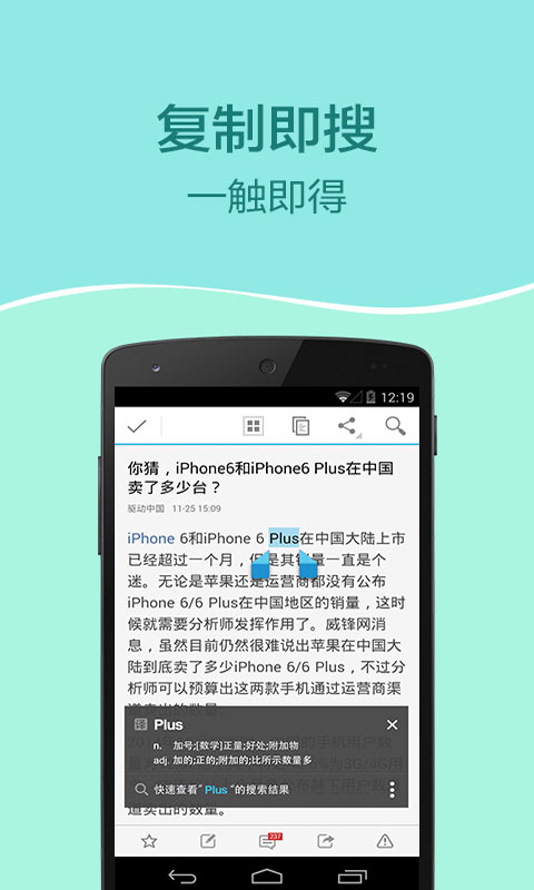 全新『省流量模式』采用智能压缩算法,在保证浏览质量的前提下可节省90%流量,即便在网络信号较弱的环境下也能流畅使用;2、精心设计的羽量级界面搭配四屏首页布局,不仅视觉效果绚丽夺目,操作体验也更加直观便捷;3、创新的全屏『搜索』界面整合了多种搜索引擎,配合独有的"搜索直达"功能,让信息获取更加精准高效;4、内置安全可靠的『支付功能』,支持主流支付方式,让手机购物更加轻松便捷;5、强大的『多标签』管理系统采用缩略图展示方式,可完整预览页面内容,标签切换如行云流水般顺畅自然;6、首创的『宫格合并』功能让网站管理更加直观,配合可自定义的快速拨号,打造专属个性化浏览器;7、独特的『发现页面』引入情绪标记系统,通过趣味图标快速匹配符合心情的内容;8、智能『亮度调节』可根据环境光线自动优化显示效果,提供最舒适的阅读体验;9、隐私保护功能全面升级,『隐身标签』确保浏览记录不留痕迹,上网更安心。