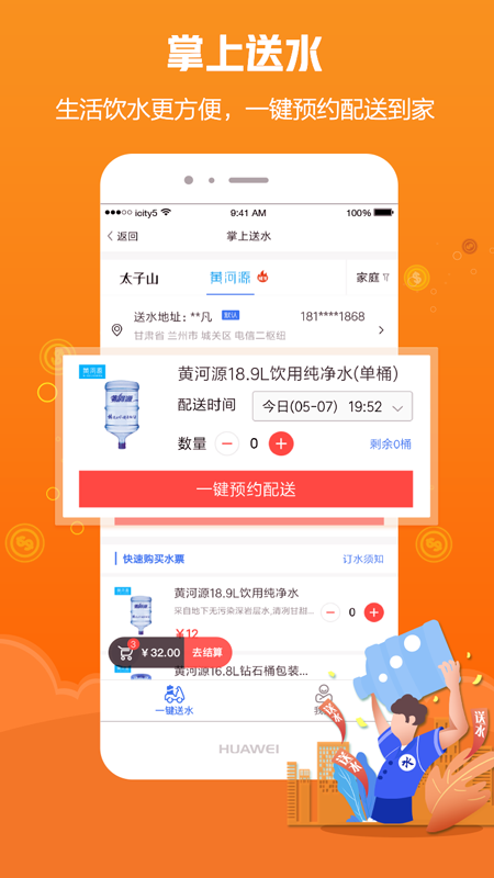 送水到家——与省内知名水站建立战略合作,确保水质安全可靠。用户可自主选择送水时间,支持在线支付和货到付款两种方式,配送范围覆盖城区所有小区。