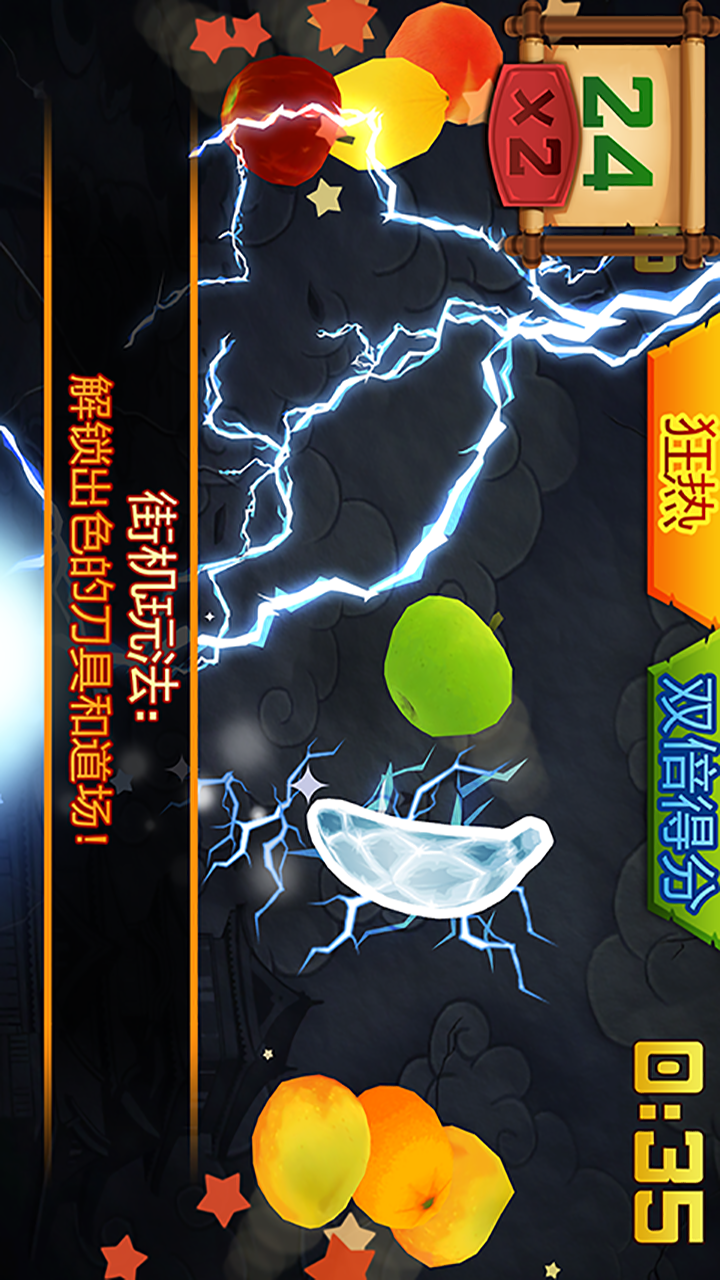 (2)在有连击的情况下(同时切中3个及以上数量的水果),无论连击的数量是多少,都是将切中的水果数×2来计分。建议观察水果飞出的轨迹,寻找最佳切割时机,争取一次性切割更多水果。