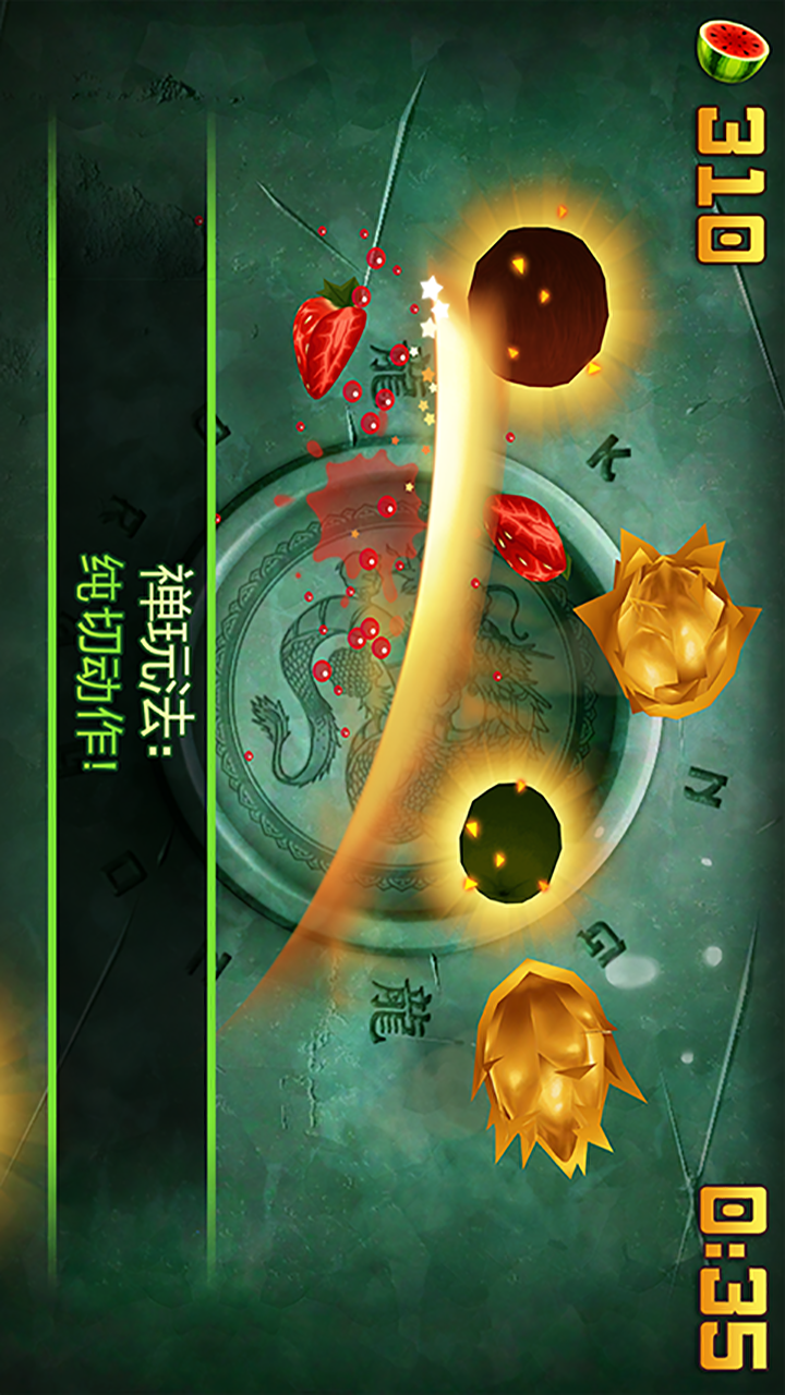 (3)在切中水果正中心时会有会心一击提示,一次+10分。这需要玩家掌握精准的切割时机和角度,多加练习可以提高会心一击的概率。