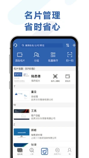 经纬名片通是BCC公司运营的专业商务工具,主要提供名片批量扫描、自动识别保存、精准信息录入等功能,同时还整合了商务社交和沟通工具。