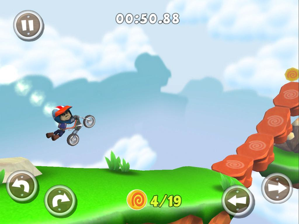 3.游戏的操作与一般的摩托车特技游戏类似,左下角的两个按钮控制车子在空中的时候向上向下倾斜,右下角的两个按钮控制车子前进和后退。面对众多障碍,在空中耍帅的时候一定要掌握好哦,否则头先着地车毁人亡,游戏就结束了。游戏贴心地提供了多种操作模式选择,包括重力感应和虚拟按键,满足不同玩家的操作习惯。