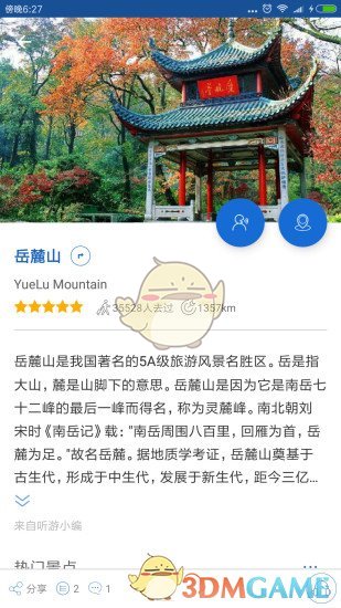 当您处在景区外时,岳麓山导游是一本妙趣横生的百科全书,图文并茂地向您展示着景区深邃的文化内涵和丰富的历史积淀。APP内置了丰富的多媒体资料库,包括高清图片、历史影像、3D模型等,让用户足不出户就能感受岳麓山的魅力。通过虚拟现实技术,还能实现部分景点的360度全景预览,为实地游览做好充分准备。