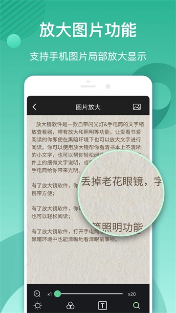 下载安装后,打开应用即可进入简洁明了的主界面。在这里,用户可以根据需要选择图片放大功能,将照片中的细节清晰呈现;或者使用文字放大功能,让阅读变得更加轻松。在"我的"设置界面,用户可以自定义软件的各项参数,包括亮度调节、放大倍数等,打造个性化的使用体验。