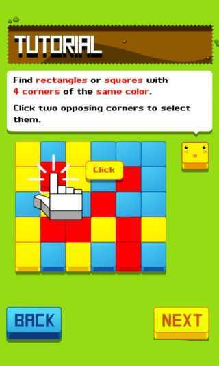 游戏的核心玩法在于理解并掌握独特的消除规则。玩家需要从看似杂乱无章的彩色方块中,找出可以组成矩形或正方形的同色方块组合。具体来说,四个同色方块可以组成"田"字形,六个同色方块可以组成3×2的长方形,以此类推。关键在于所选矩形的四个顶角方块必须是同一种颜色,这样的组合才能被消除。游戏提供了两种操作方式:一种是直接点击矩形对角线的两个顶点,另一种是按住一个顶点向外拖动来选择范围。成功消除后,空缺位置会被新的彩色方块填补,为玩家创造新的消除机会。