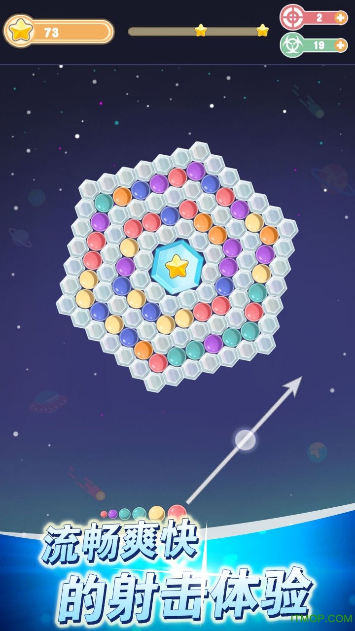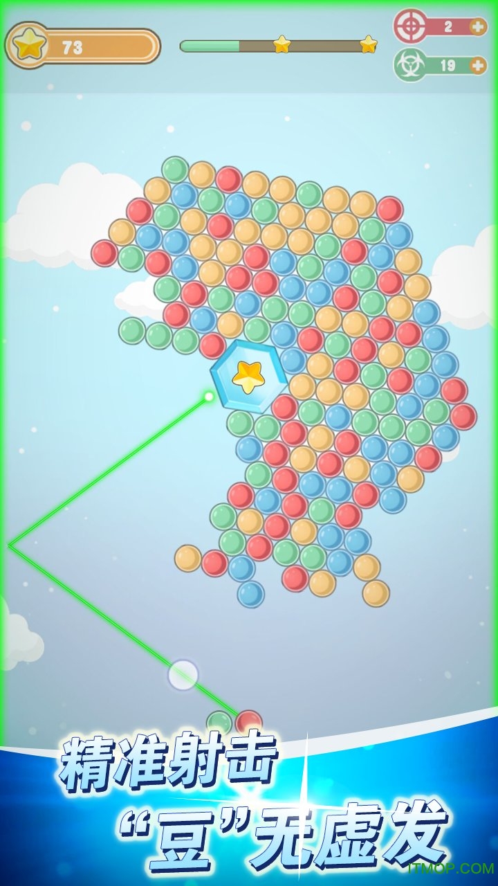 -流畅爽快的射击,只需要点击屏幕即可瞄准射击。精准的物理引擎让豆豆的反弹轨迹真实自然,增加了游戏的策略深度。