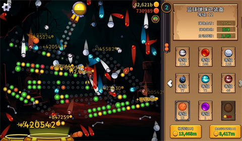 4、当弹珠投射到绿色的珠子位置时,珠子将会被弹珠碰到,而被碰到的珠子会消失;消失的珠子会产生连锁反应,可能触发区域清除效果。某些特殊珠子被击中后会释放增益效果,比如临时增加弹珠数量或提高移动速度。珠子消失时的粒子特效非常绚丽,给玩家带来强烈的视觉反馈。