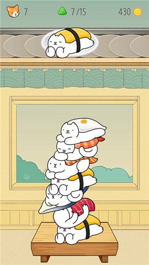 游戏采用原创的日式寿司屋场景设计,搭配大量萌趣的动画元素,从寿司猫的表情到背景细节都充满童趣,让堆叠过程充满欢乐。