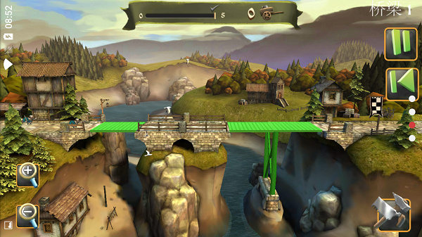 游戏的核心玩法是考验玩家的创造力和工程思维。操作方式简单直观,只需点击选择材料并拖动放置即可。游戏提供了木板、树干、砖块、绳索等中世纪常见的建筑材料。玩家需要根据地形特点,合理设计支撑结构,确保桥梁能够承受马车和行人的重量。游戏还提供了撤销功能,让玩家可以反复尝试不同的设计方案。完成建造后,点击测试按钮即可检验桥梁的稳固性。