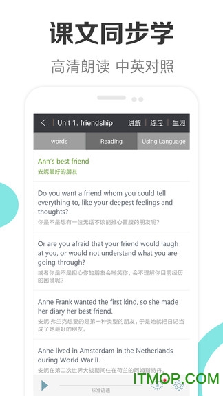 新课标高中英语助手全面覆盖高中英语教材内容,从必修1到选修10的单词和课文都配有同步翻译和真人高清发音,支持跟读和点读功能。每个单元的重要语法和知识点都有详细解析,并配有相应的练习题及答案,帮助学生巩固所学内容。软件还提供单词的联想记忆法、相关短语和例句查询功能,让单词记忆更加高效。特别值得一提的是,离线搜索功能可以快速定位课文中的句子并显示翻译,解决学习中的疑难问题。点读功能则允许学生对特定单词或句子进行重复听读,确保发音准确无误。