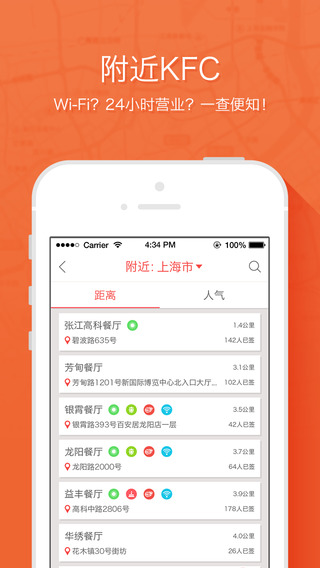 附近KFC:查看你附近的肯德基餐厅并签到分享给朋友,还能查看门店特色服务和营业时间;