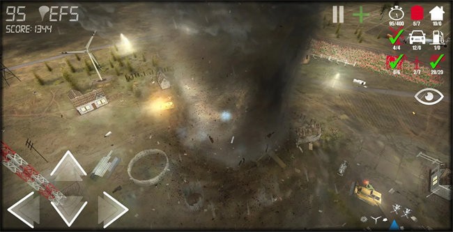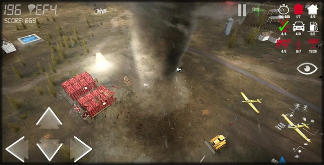 进入游戏后可以查看需要完成的任务,左侧的按键可以操控龙卷风的移动,右上角可以查看摧毁的建筑统计;随着破坏程度提升,龙卷风会不断升级,解锁更强大的破坏能力。