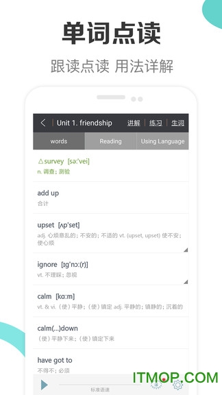 包含高中必修1到选修10的单词和课文带同步翻译,真人高清发音,可跟读、可点读。教材内容与学校教学进度同步,是课堂学习的完美补充。