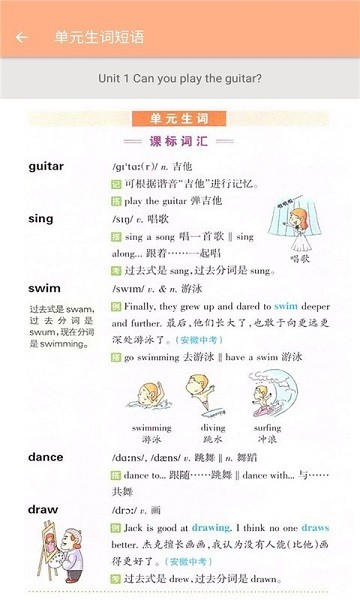 包含完整的单元生字库、常用短语汇总、高清电子课本、教材参考答案、重点句型解析以及语法精讲视频。每个知识点都配有详细解释和实用例句,帮助学生构建扎实的英语基础。