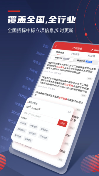 行业覆盖广、查询操作简单便捷,支持多维度筛选,确保招标信息不再遗漏,提高信息获取效率。