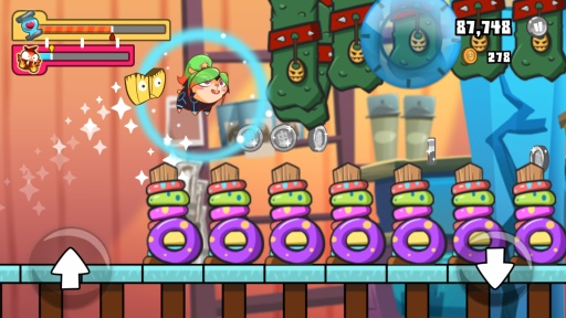游戏界面设计简洁明了,角色选择界面采用卡通风格,每个角色都有专属动画展示。游戏操作采用经典的双按键设计,左侧控制跳跃,右侧控制滑行,简单易上手但需要精准的时机把握。界面左上角实时显示角色状态,包括生命值和怒气值积累情况。右上方则显示当前得分和奔跑距离,让玩家随时掌握游戏进度。