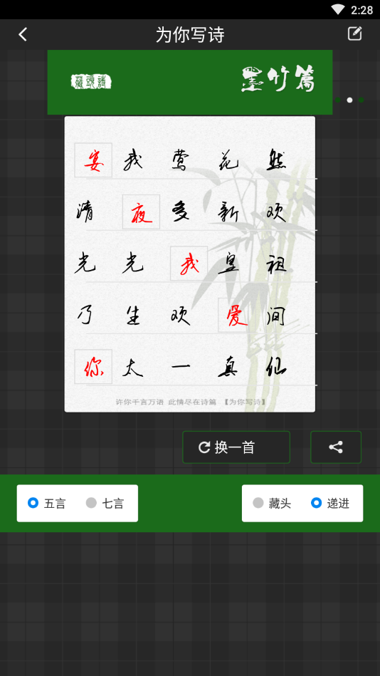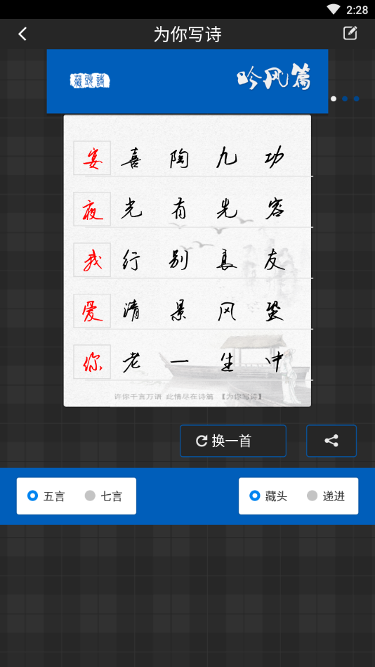 为你写诗藏头诗是一款功能丰富且极具创意的藏头诗制作软件,无论是用于浪漫表白、节日祝福,还是日常娱乐,它都能满足您的需求。该软件支持五言和七言诗的生成,并提供了多种藏诗模式,包括藏头、藏中、藏尾以及递进式藏诗,让您的创作更加灵活多样。无论您是诗词爱好者,还是想用独特的方式表达情感,这款软件都能为您带来惊喜。喜欢的朋友们不妨下载体验,开启您的诗意之旅!