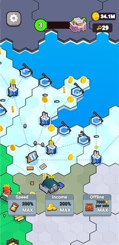 游戏采用轻松有趣的经营模式,玩家可以通过收购周边土地来扩大产业规模。不同区域的地价和资源分布各具特色,需要制定差异化的投资策略。