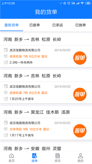 点击进入页面,用户乐意在这里看到自己的各种货单信息,包括待接单、运输中、已完成等状态,方便管理运输任务。