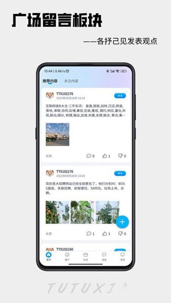 随时留言:在广场板块,用户可以随时发表留言,与其他用户交流观点,畅所欲言。