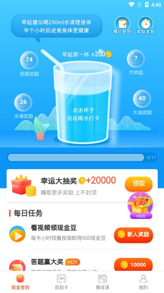 每日签到,每日任务,限时推荐,幸运,趣味猜成语等。喝水宝app不仅提供基础的喝水提醒功能,还设计了丰富的互动玩法,如每日签到领金币、限时特惠任务、幸运抽奖以及趣味猜成语等小游戏,让用户在养成健康习惯的同时享受更多乐趣。
