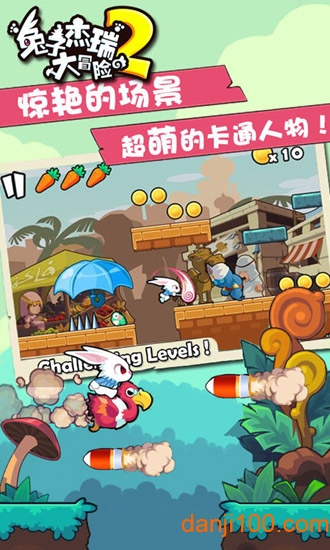 萌系画面美轮美奂游戏画面采用的是卖萌无下限的卡通风格,复古的场景,艳丽的彩色,沿路各种各样精致的元素,仿佛将大家带入了一个梦幻的卡通世界,多变的场景,可以大大缓解玩家的视觉疲劳,被萌化的主角小兔,犹如一团白色的小球一般可爱,一碰一跳的游走在这个国度,小小的身体不断迸发出大能量。游戏中的光影效果和粒子特效也相当出色,为童话世界增添了更多梦幻色彩。