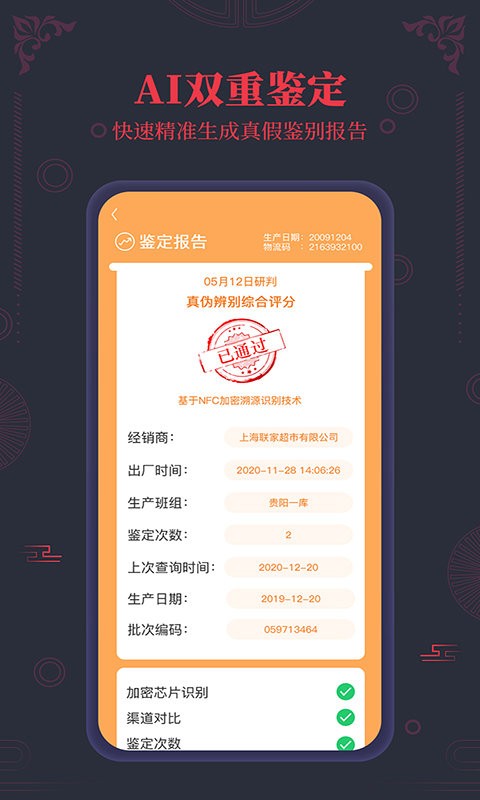 本系统采用多重防伪验证机制,确保鉴别结果的准确性:首先通过比对出厂数据及全国海量的流通样本数据,系统会智能生成大数据综合评分;其次,生产日期查询功能可有效识别重码、错码等异常信息,精准筛查假冒产品;此外,物流码查询功能通过与原厂物流信息进行比对,可生成三码一致验证结果,为用户提供专业级的真假鉴别报告。