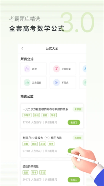 除了丰富的学习资源外,考神君高中数学app还提供多种实用功能。比如智能错题本功能会自动记录和分析你的错题,找出知识薄弱环节;知识点速查功能可以让你快速回顾重要公式和定理;学习进度跟踪功能则能清晰展示你的学习轨迹。这些贴心的设计让数学学习变得更加高效、便捷。