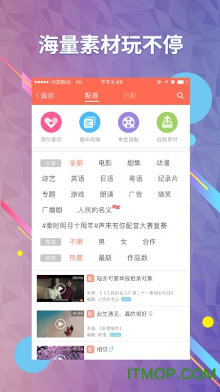 不同的片段、不同的角色、不同的台词,每天都有不同的新素材让你总有不同的体验。从影视剧到动画片,从广告到纪录片,各种类型应有尽有,满足你的各种配音需求。
