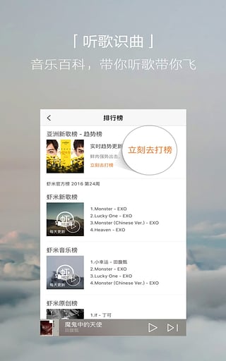 2016年5月,五月天《作品9号》的神秘彩蛋让众多五迷直呼过瘾;同月,林宥嘉《今日营业中》的压话版单曲评论当日破千;2016年6月,EXO《EX'ACT》中韩专辑同步上线;还有田馥甄的2016全新专辑蓄势待发。虾米音乐始终站在音乐潮流前沿,为用户带来最新鲜的音乐内容。