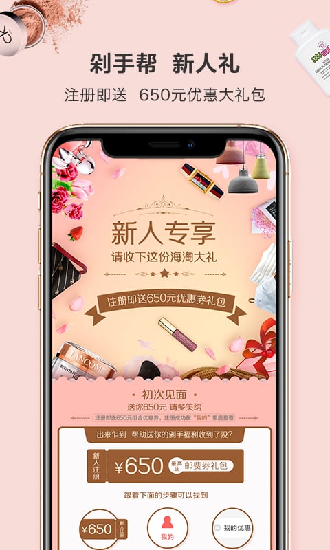 剁手帮海淘为新用户准备了超值大礼包,注册即送650元新人优惠券。平台定期举办全球百货狂欢节,海量商品限时特惠。我们还与海外保持同步上新节奏,让您第一时间买到最新款商品。所有商品均保证正品,支持包邮直邮服务,购物全程无忧。