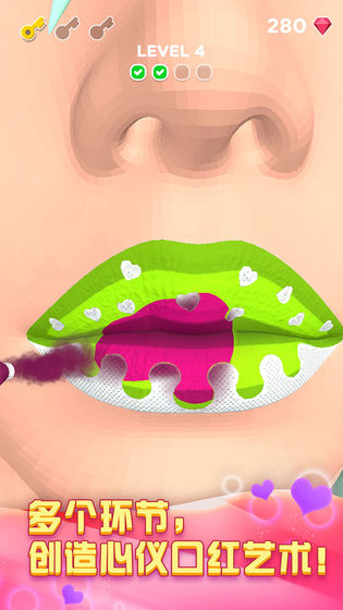 OMG涂它游戏开创性地将美妆与休闲游戏相结合,带来前所未有的游戏体验。玩家不仅能自由选择心仪的口红色号,还能通过精准的涂抹操作打造完美唇妆。游戏特别设计了多种唇形模板,从樱桃小嘴到性感厚唇一应俱全。完成妆容后,玩家还可以使用自拍功能保存作品,或通过社交平台分享给好友。无论是美妆达人还是新手小白,都能在这里找到属于自己的乐趣。