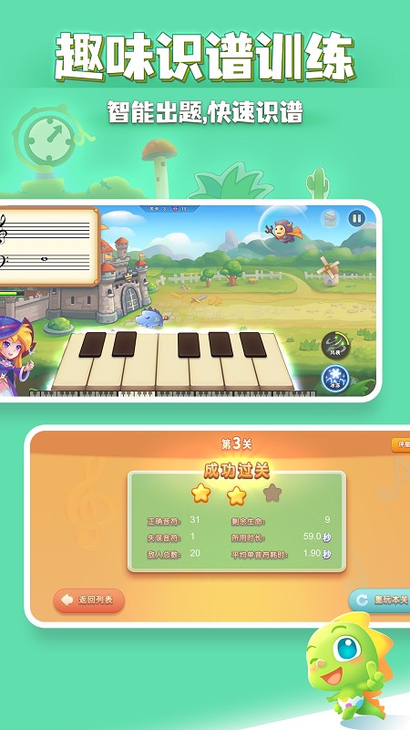 针对识谱这一学习难点,开发了趣味十足的识谱训练模块。系统会根据孩子对音符的掌握程度智能出题,重点练习不熟悉的音符,并按照课程进度进行渐进式训练。这种个性化的学习方式能让识谱学习事半功倍,帮助孩子快速提升识谱能力。
