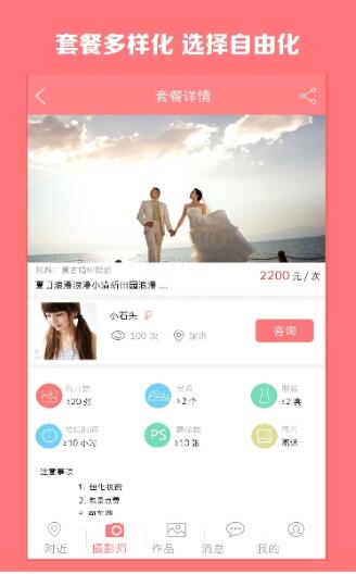 顶级摄影师资源:平台汇集了全国各地最优秀的摄影师,每日更新大量极具特色的摄影作品。你可以零距离接触这些追求创意与个性的专业人士,选择各类定制化的摄影服务套餐。