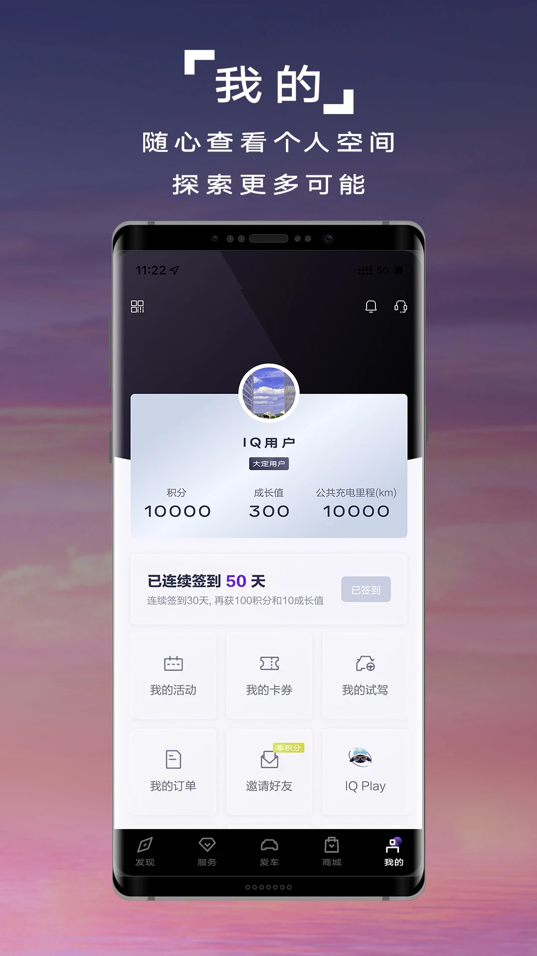 我的:查阅自己的专属积分、成长值、里程,系统会根据用车习惯智能推荐个性化服务套餐。体验权益增长:用积分兑换惊喜福利,用成长值解锁专属惊喜;还可查订单、邀好友、提问题。