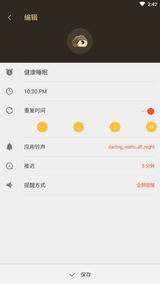 多种闹钟提醒逻辑,还信用卡(按月)、交房租(隔月)、按时吃药(一天多次)、生日管家(按年)、驾照年检(隔年)等,无论你是学生还是上班族,都能满足你的不同需求;特别开发的智能跳过节假日功能,让工作提醒更人性化;