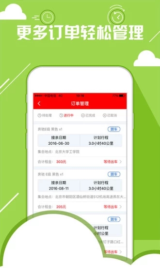 【抢单功能】平台每天发布大量优质婚车订单,车主可根据自身情况参与抢单。平台智能派单系统确保订单分配公平高效,租客需提前支付全款,保障交易安全。创新的账户管理系统让您轻松管理所有账单,赚钱更省心。