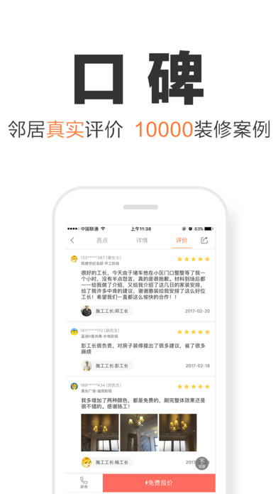 【真实评价】平台建立了完善的用户评价体系,所有装修案例都配有业主的真实点评,完整记录装修过程中的心得体会,帮助新用户做出明智选择。
