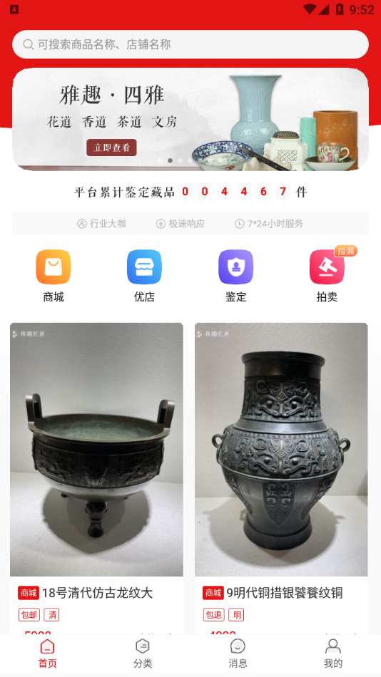 雅趣匠意app涵盖了茶道、花道、香道、文房、书画篆刻、陶瓷紫砂、文玩杂项、珠宝玉石、钱币、宗教文化、民俗装饰等11大门类,内容丰富多样,满足不同用户的兴趣需求。平台不仅提供商品展示、浏览、购买、拍卖、收藏等基础功能,还支持支付、物流查询和在线沟通等便捷服务,真正实现了艺术品交易的线上化,为商家和用户搭建了一个高效、安全的综合性交易平台。