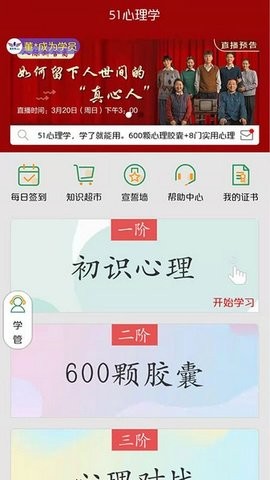 心理课程:无论是心理学爱好者,或是有心理困惑,海量心理课程供你挑选,知名大咖伴你学习。课程体系覆盖发展心理学、认知心理学、临床心理学等主流分支,由国内外顶尖高校教授和资深心理咨询师授课。课程形式多样,包括直播讲座、案例分析、情景模拟等,确保学习效果。