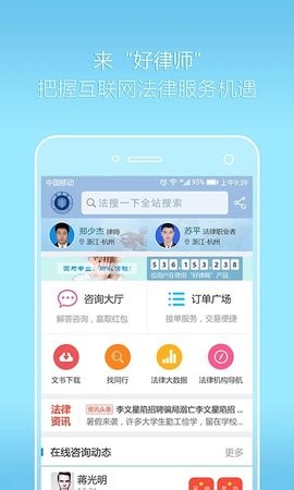 平台设有专门的订单广场功能,内置完善的交易指南,帮助用户快速掌握接单交易流程;实时更新的法律资讯板块会为您推送最新头条新闻,并智能标注关键词,方便快速浏览;法律大数据功能详细展示了行业内的各类数据信息,助您把握行业动态;文书下载功能支持用户预览后直接保存到本地,满足各类文书使用需求。