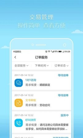 内置法律机构导航功能,可在线查看附近各类法律服务机构并直接前往办理业务;咨询大厅功能让律师可以查看用户的法律咨询问题并进行专业回复;交易管理系统操作简便,订单状态实时更新,让业务管理更加高效;支持与客户进行一对一的多形式沟通,包括视频、语音、图文等多种交流方式。