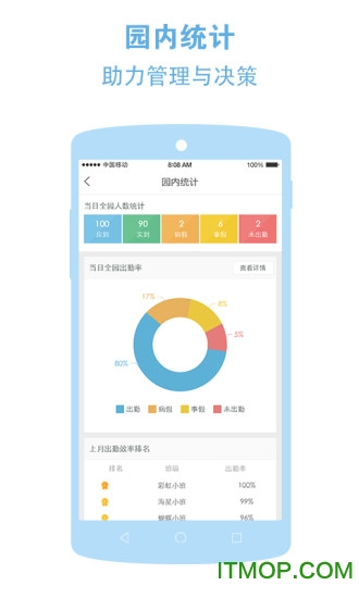园内统计:数据看板支持自定义时间范围对比,可生成折线图、柱状图等可视化报表。新增缺勤原因智能分析功能,自动识别常见请假类型,帮助园长优化管理制度。支持数据导出Excel,方便进一步分析处理。