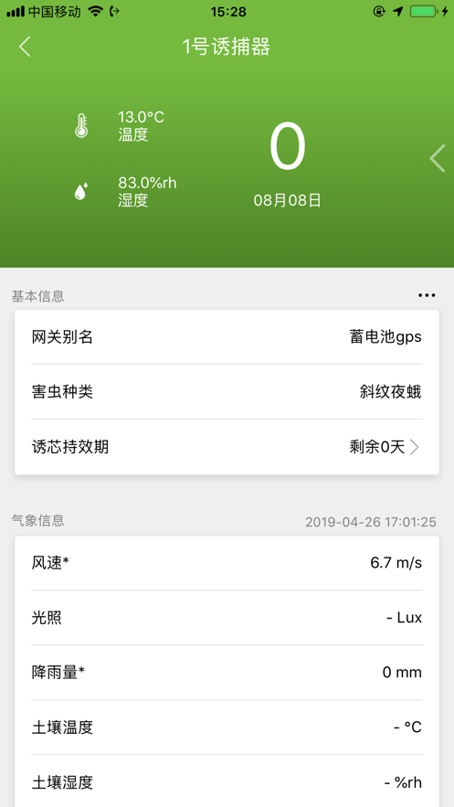 数据查看功能:在app主界面,用户可实时查看诱捕器的捕虫数量、环境温湿度及风速等关键指标。系统还支持按年、月、日等时间维度生成诱捕记录曲线图,帮助用户直观掌握害虫活动趋势。
