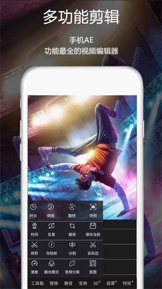 【视频编辑】通过插入关键帧,视频编辑、剪裁、合并、分割、翻转、复制,调节位置、中心点、旋转、缩放、透明度、斜切、速度等参数,实现AE视频特效。即使是复杂的动画效果也能轻松完成。