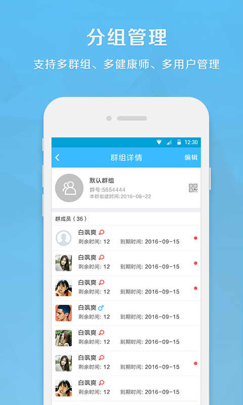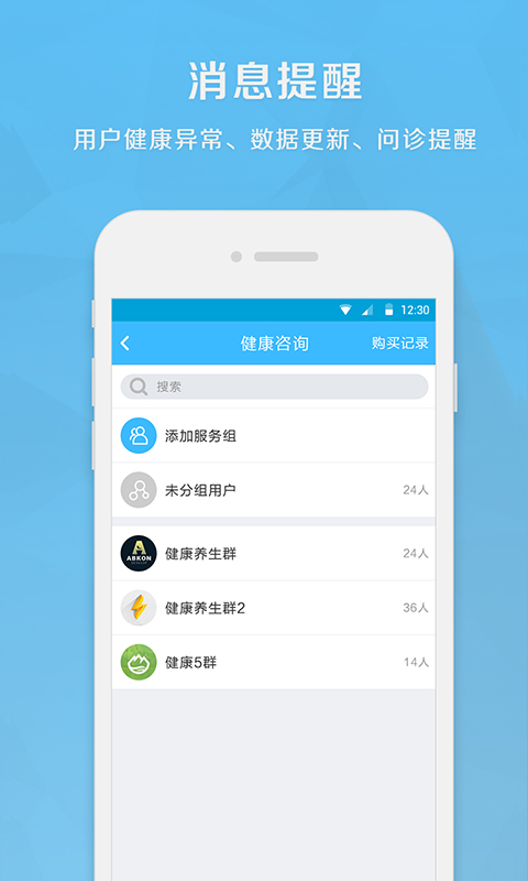会员管理:对病人进行分类管理、备注病人信息,查看病人的健康数据、体检报告、病历、饮食记录。提供多维度的患者画像分析工具。