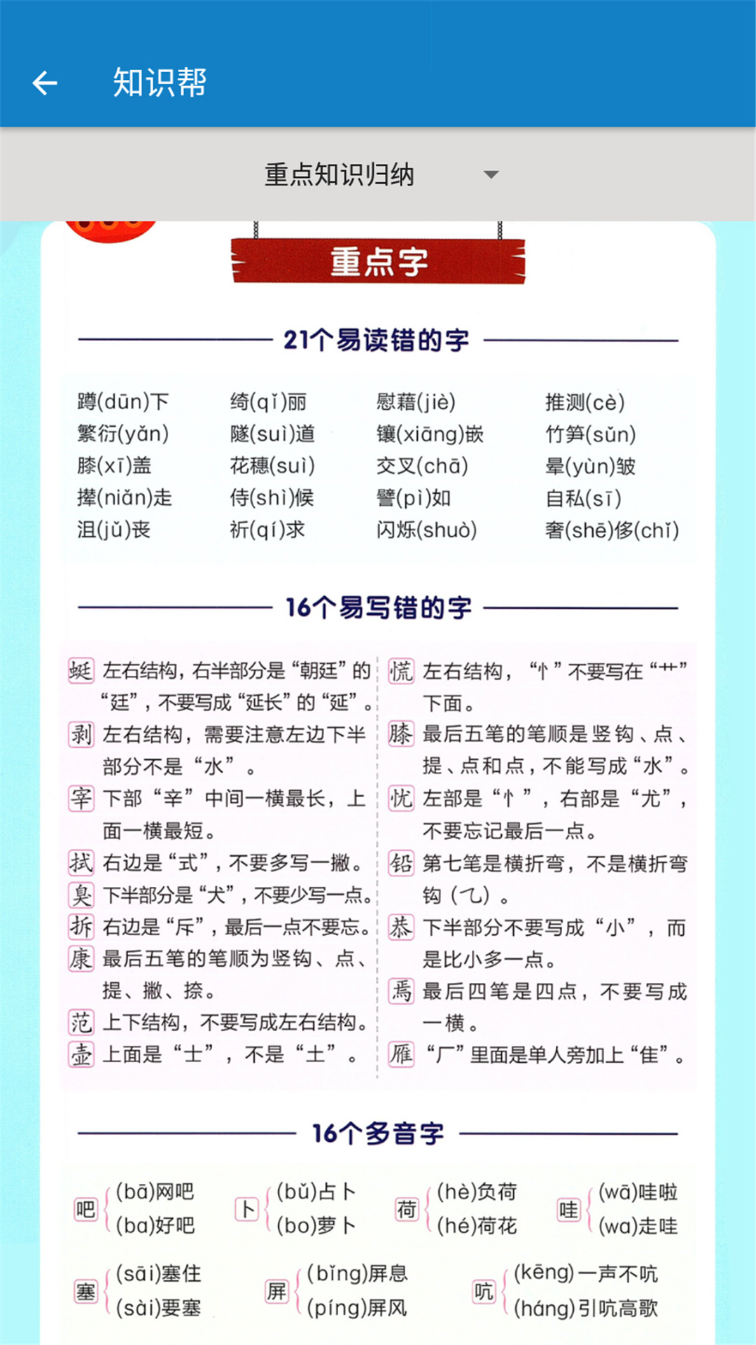 知识帮功能对每个单元的知识点进行系统归纳,包括生字词、重点句子、段落分析和篇章结构等。这些归纳总结帮助学生快速抓住学习重点,建立完整的知识框架,提高学习效率。