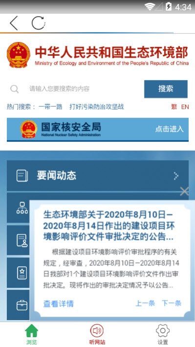 设有多个不同的板块,主要有要闻动态、组织机构、政策文件、环境质量、业务工作。