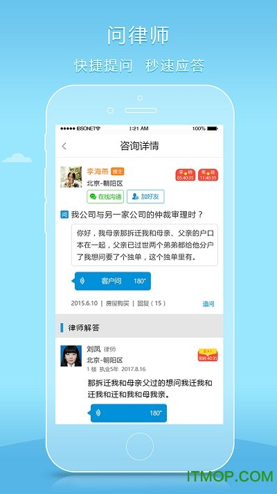 呼叫律师:创新性的语音下单功能让咨询更加便捷,律师将在最短时间内回电解答。每次咨询仅需30元,价格亲民实惠。