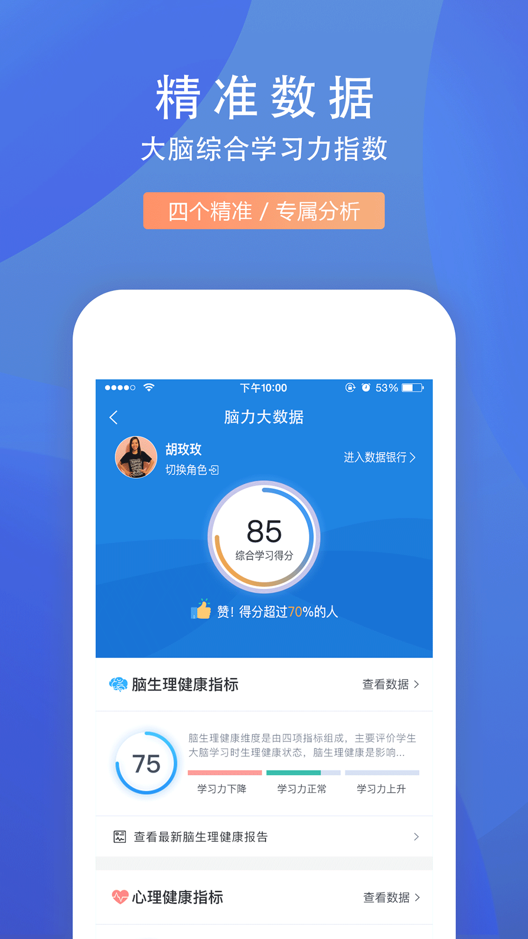在精准数据方面,平台独创性地开发了大脑综合学习力指数评估系统,通过四个维度的精准测量和专属分析,为用户提供全面的脑力评估。脑力报告功能则能够对用户的脑力数据进行专业解读,生成包含四个专项报告的综合分析结果,帮助用户深入了解自身脑力发展状况。